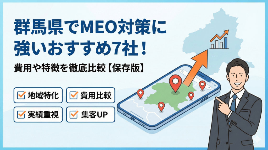 群馬県のビジネスオーナーの皆さん、Googleマップ上での目立つ存在になりたいと思いませんか?この記事では、群馬県内でMEO対策に特化した7社を厳選し、それぞれの費用、サービス内容、特徴を徹底比較します。高崎市の賑やかな商業地から、草津町の温泉地まで、群馬県の多様な地域特性に合わせたMEO対策がここにあります。各社の実績、評価、そして何よりもコストパフォーマンスを重視したこの比較は、あなたのビジネスを次のレベルへと導くための重要な一歩となるでしょう。群馬県でのビジネス成功の鍵を握るMEO対策会社を見つけるための旅に、今すぐ出発しましょう!