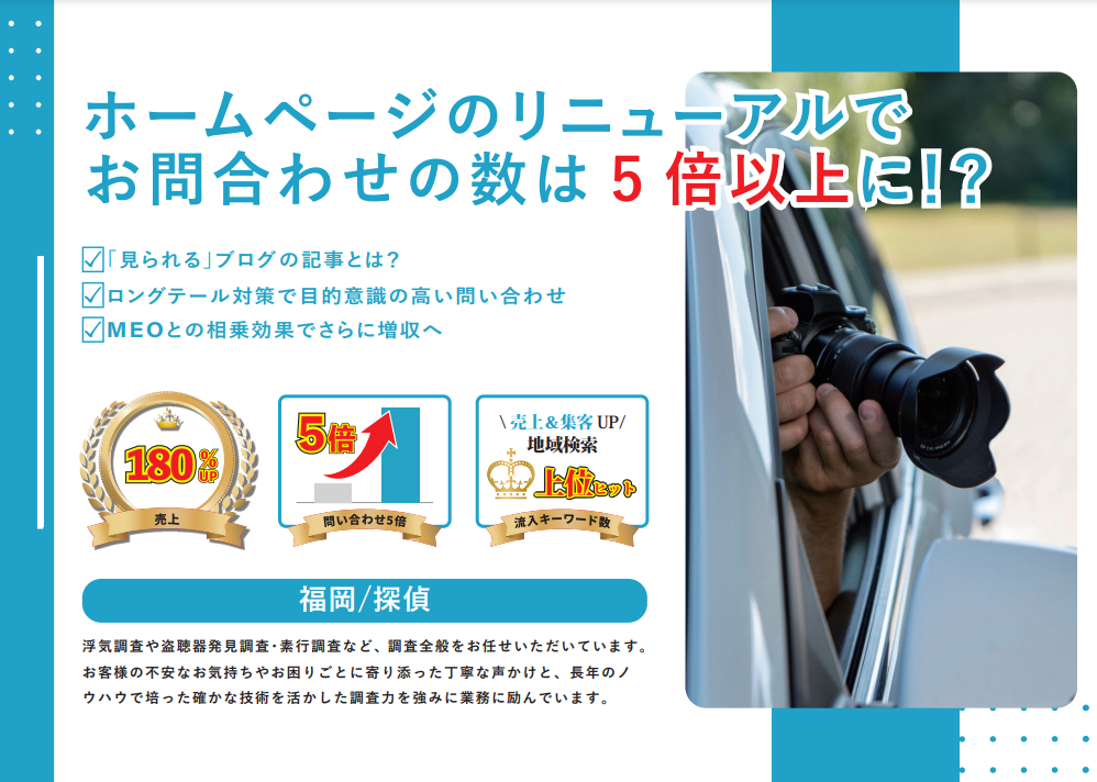 ホームページリニューアル後は、お問い合わせは、2桁は軽く超えるほどいただくようになり、売上も180%は増えています。また、お問い合わせの質にも変化があります。もともと漠然としたお悩みの依頼などが多かったのですが、より明確に法律行為を求めるようなお問い合わせが増えました。直接、売上につながるお問い合わせが多いので忙しい日々が続いています。