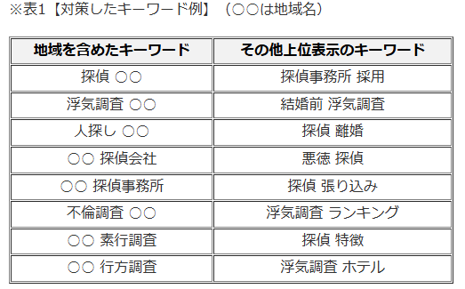 「浮気調査 ○○」「探偵 ○○」など、地域名を含めた検索キーワードを意識して対策。(※表1参照)