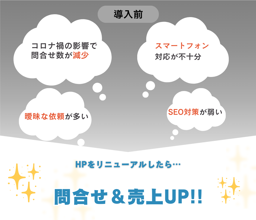 そこで、ホームページをリニューアルし、Googleマップ(Googleビジネスプロフィール)の活用を強化したところ、お問い合わせ数が5倍以上に増加、売上も150%〜180%アップという目覚ましい成果を達成しました。