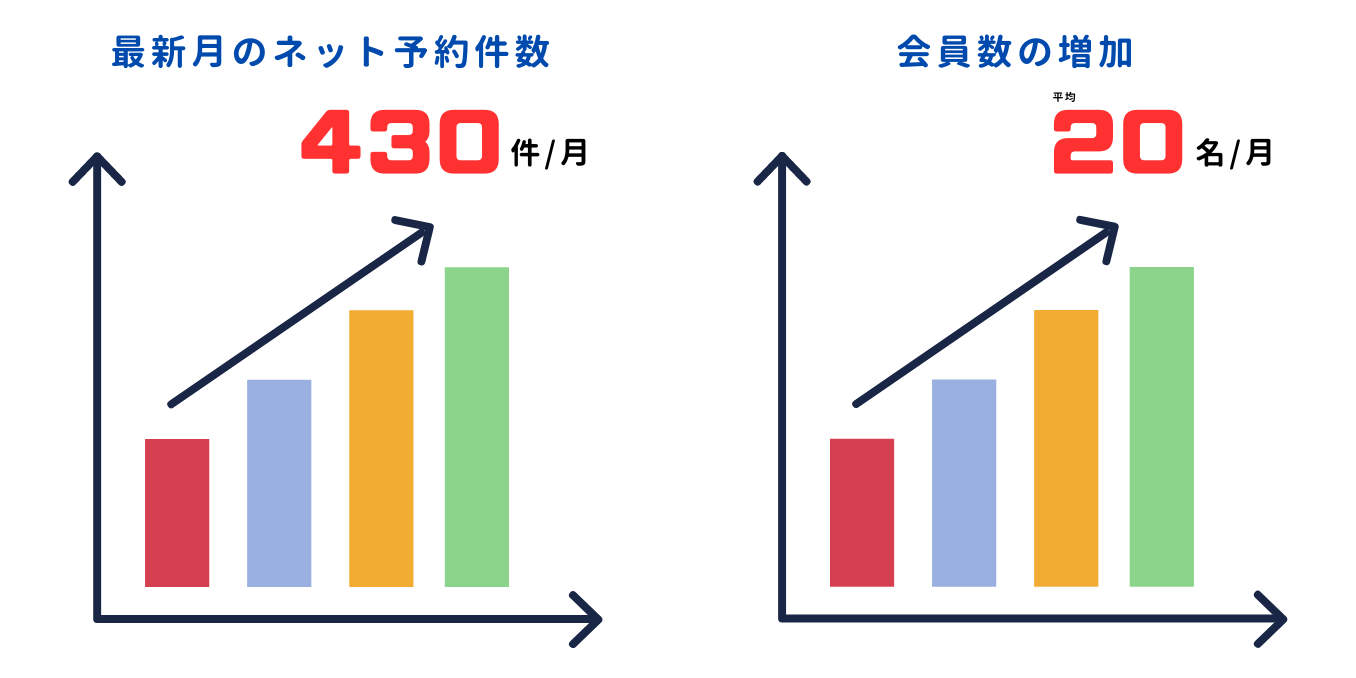 昨年秋頃の導入でしたが、割とすぐにアプリを通じてネット予約が入るようになりました。年が明けて3月頃までには、アプリが浸透し始め、会員数が一気に増えました。現在も毎月平均して20名ずつ新規会員が増えています。ネット予約も着実に入るようになり、最新月の予約は430件を超えました。特に週末は予約が増える傾向にあります。