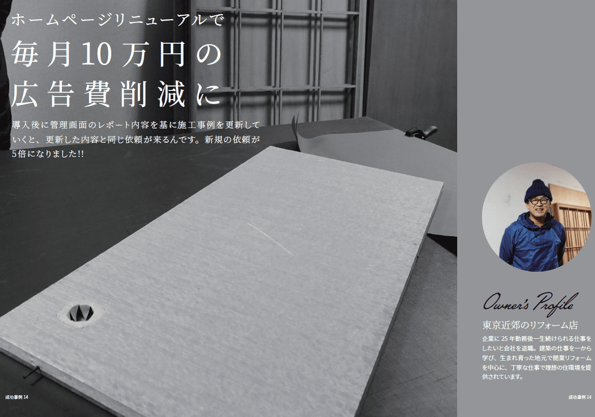 導入後更新を続ける事でアクセス数が徐々に上がってきて、管理画面のレポートで施工事例を見ている事が多いとわかり、サポートに相談し施工写真を増やし、具体的な施工内容を書くと・・・・