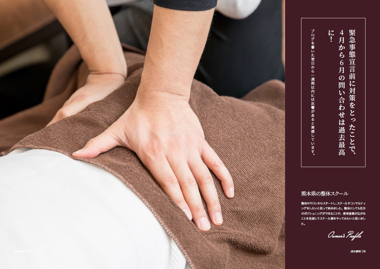 整体のサロンからスタートし、スクールやコンサルティングをしたいと思って始めました。整体としても自分のポジショニングができることや、教育産業が広がることを見越してスクール業をやってみたいと思いました。