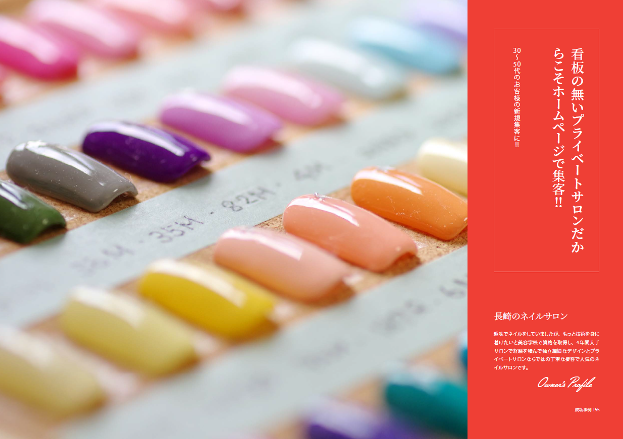 インスタグラムやSNSでデザインを上げているサロンは多いと思いますが、実際の来店につなげる為には、予約する前にホームーページでお店を知っていただく事が重要だと思います。路面店などはふらっと入ってくるお客様もいると思うのですが、プライベートサロンはマンションや自宅の一室でされているサロンも多くどんなサロンなのか不安になる事もあると思います。サロンのコンセプトをわかりやすく伝えたり、ブログで情報発信を定期的にすることで安心感を与える為にホームーページは最適なサービスだと思います。