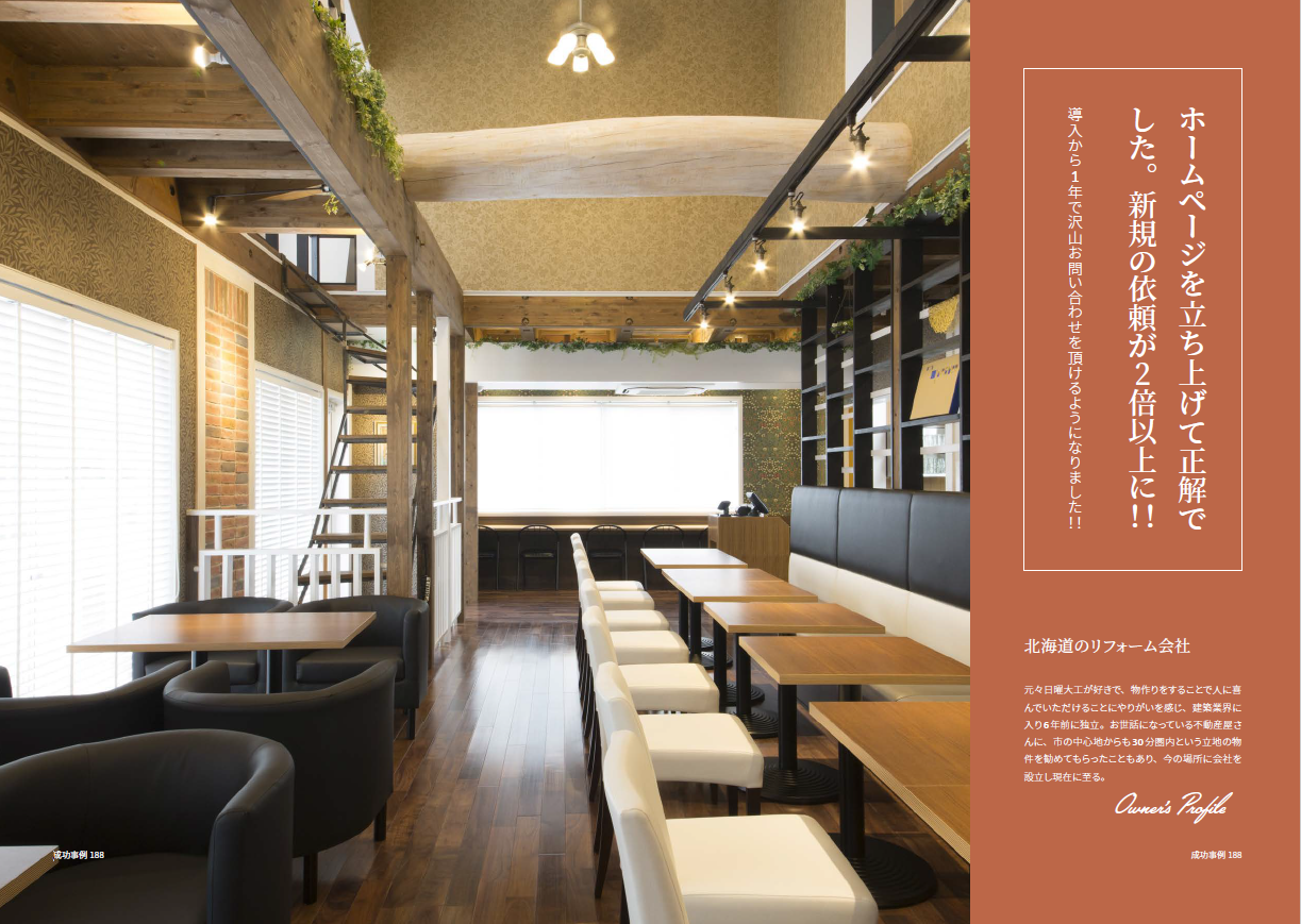 ホームページを公開して半年位してから、徐々に検索の順位が上がってきて、ホームページを公開して1年位で「地域+店舗改装+価格」「地域+店舗改装+相談」などで1ページ目に出てくるようになって、今では「地域+店舗改装」でも1ページ目に出てくるようになり、本当にお客様から沢山の問い合わせを頂けるようになりました。2倍以上新規の依頼が増えています。ホームページから問い合わせが来る事、これがなによりありがたいです。問い合わせが無いと仕事が始まりませんから。
