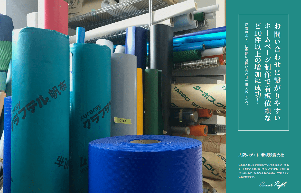 いわゆる職人業で店舗のテントや看板作成から店舗への看板設営や、車のシートなどの張替えなどを行っています。会社自体が小さいので、納期や金額の融通などが利きやすいのが特徴です。