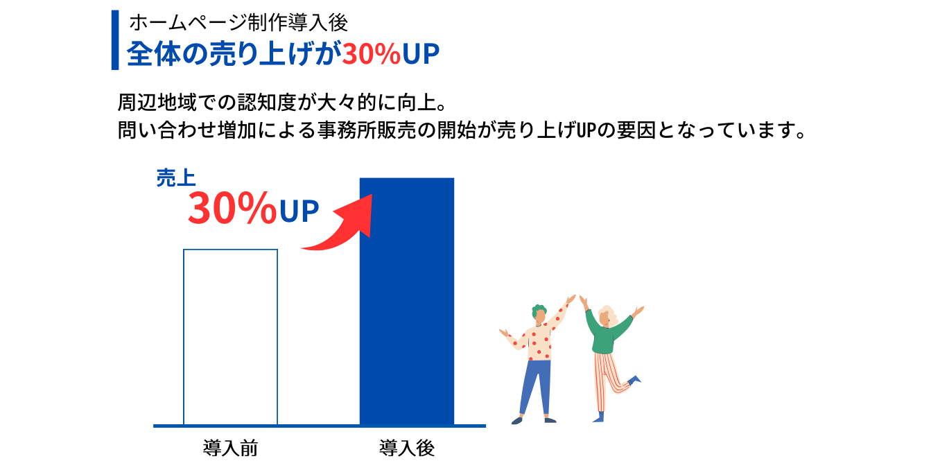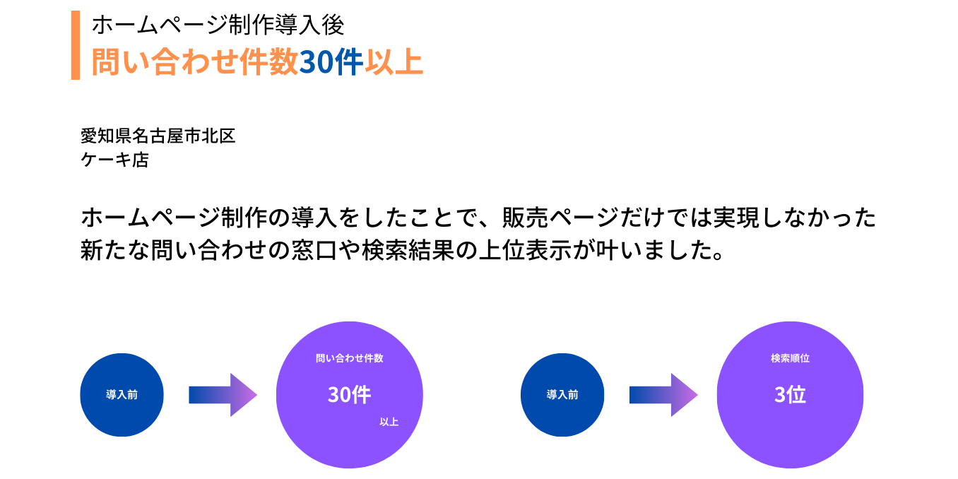 【周辺地域 チーズケーキ】や【砂糖不使用 ケーキ】で検索をかけると、当店が上位に表示されるので周辺地域での認知度が向上していると実感します。オンラインでの購入においては、通販サイト内の直接検索が主流で、ホームページから購入ページへの流入率は4%となっています。全体の売上は30%ほど向上し、事務所での在庫販売とホームページからの流入がその成果をもたらしています。ホームページ制作導入をしたことで、販売ページだけでは実現しなかった、新たな問い合わせの窓口や検索結果の上位表示が叶いました。売上と認知度の向上に大きく貢献してくれています。
