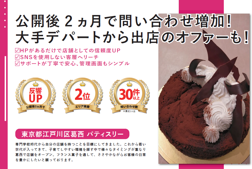 サイト公開後2 ヵ月ほどで、HPからの問い合わせが増え始めました。内容は、誕生日のホールケーキ・会社様のイベント用洋菓子・保育園や学校のイベント用洋菓子などでした。以降は同じくらいのペースで安定してお問い合わせが続いています。生産体制が追い付かずお断りしてしまいましたが、大手デパート様から出店のオファーもいただきました。