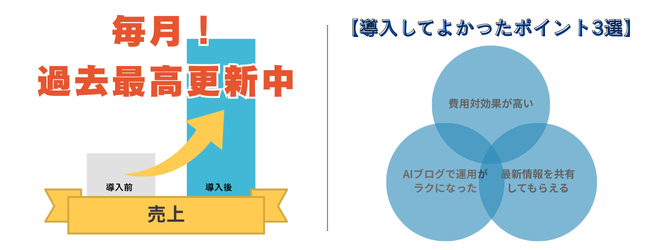 導入してよかったポイントの一番はやっぱり費用対効果の高さですね。掛けた以上のリターンをしっかり感じています。それに“育つホームページ”という感覚があって、時間が経つほど情報が増えて、どんどん強くなっていくのが面白いです。あとはAIブログが本当に便利で助かってます。正直、文章を書くのはあまり得意じゃないんですけど、AIがベースを作ってくれるので、かなり楽になりましたね。営業さんやサポートの方からも最新情報や改善提案の情報共有をもらえるので、常にブラッシュアップできています。