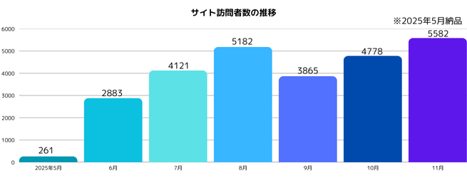 解析データを確認すると、導入後のデジタル面での効果が明確に表れています。まず、AIオーバービューで63回、ChatGPT検索で8回表示されており、生成AI経由での露出が着実に増加しています。検索キーワード数も大幅に伸び、11月は10,085件と、10月の約7,000件からわずか1か月で3,000件以上増加しました。トラフィックは約1,800件、サイト訪問者数も公開翌月の2,800人から、11月時点で5,500人まで倍増しています。また、「温泉」に関連する複数の主要キーワードで検索1ページ目に表示されており、検索上位による流入増が成果につながっていると考えられます。