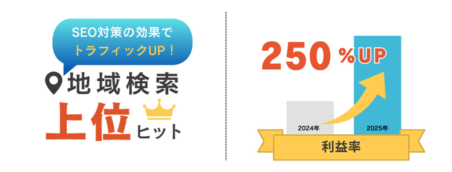 反響は、導入してすぐに感じました。次の月くらいから、これまであまり来なかった若い男性のお客様が来店され、「調べてホームページを見ました」「Googleで出てきたので来ました」と言われることが増えました。さらに驚いたのは、「ゆっくりできるカフェ」「〇〇エリアで調べたら出てきた」など、想像していなかったキーワードでも検索にヒットしていると聞いたことです。実際にお客様の声から、検索をきっかけに来店につながっていることを強く実感しています。売上は大きく変わらなくても、利益は前年比で約250%アップしており、確かな成果を感じています。