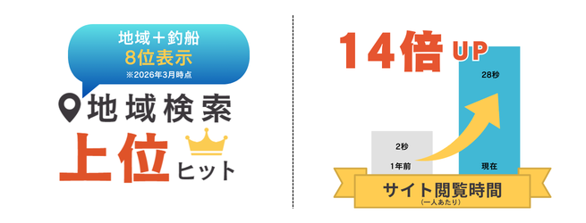 以前は1人あたりの平均閲覧時間が約2秒と短い状態でしたが、現在は約28秒まで伸びており、サイト内容をしっかり閲覧するユーザーが増えています。また「地域名+釣船」の検索で8位を獲得。公開から2か月後には毎月600人以上が訪問し、最多で1,300人のアクセスを記録しました。現在のトラフィックは57まで成長しており、地域検索での認知も着実に高まっています。