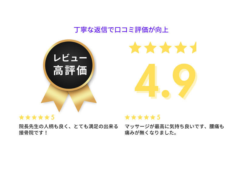 口コミの影響力を見越し、口コミをいただく代わりに精算時にクーポンを適用させていただいています。その後の口コミへの返信も丁寧に行い、キーワードも適切に組み込むようにしています。お客様からの評判を活用しつつ、ご新規様を引き込むことに成功しました。