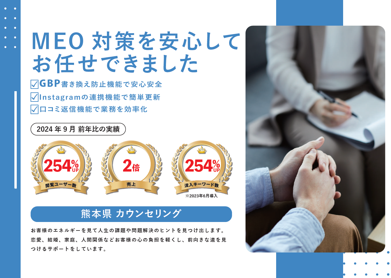 導入前はMEO対策が全くできておらず、競合他社に負けていることが課題でした。MEO対策を導入してから、Instagramの投稿をコンスタントに続けることで、Googleマップで上位に表示されるようになりました。