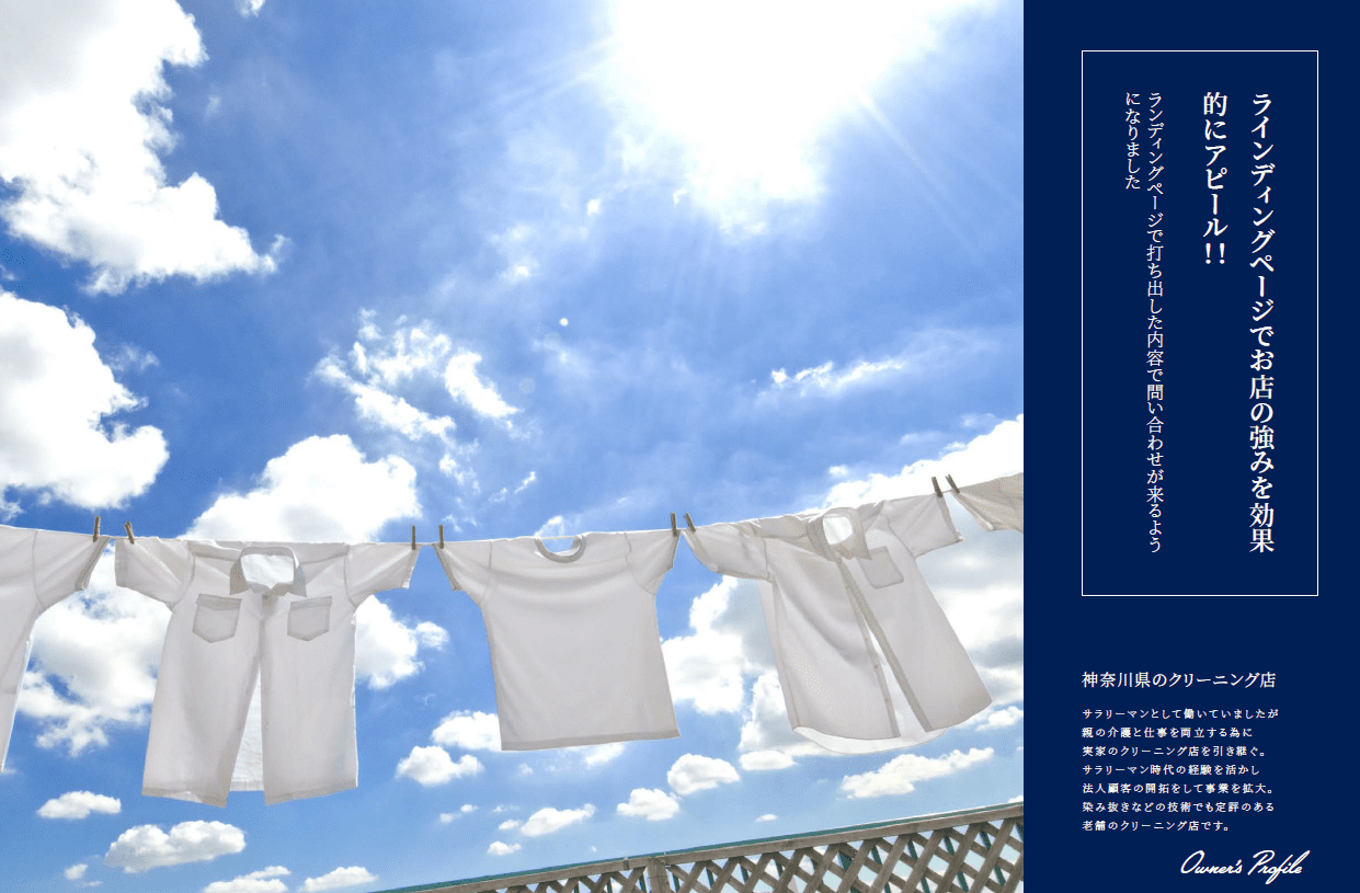 ランディングページはキャンペーンやサービスの打ち出しが簡単に出来るので、我々のようなサービス業には非常に活用しやすいサービスだと思います。特にクリーニング業界は衣替えなど季節によってお客様に打ち出したい内容が変わるので、そこを簡単にアピール出来て修正も簡単に出来るのもいいですよね。最近は本当に忙しいので、ランディングページでスタッフの求人なども打ち出していこうと考えております。