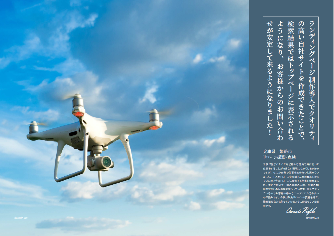兵庫県 姫路市 ドローン撮影・点検 子供が生まれたことなど様々な理由で外に行って仕事をすることができない環境になってしまったのですが、なにか自分で仕事を始めたいと思っていました。主人がドローンを飛ばすための資格を持っていたので今のドローンに関係する仕事を始めました。主にご自宅や工場の屋根の点検、企業のPR用の空からの写真撮影を行っています。個人でやっているのでお客様の様々なニーズにこたえやすいのが強みです。今後は私もドローンの資格を得て、動画撮影なども行っていけるように頑張っている最中です。