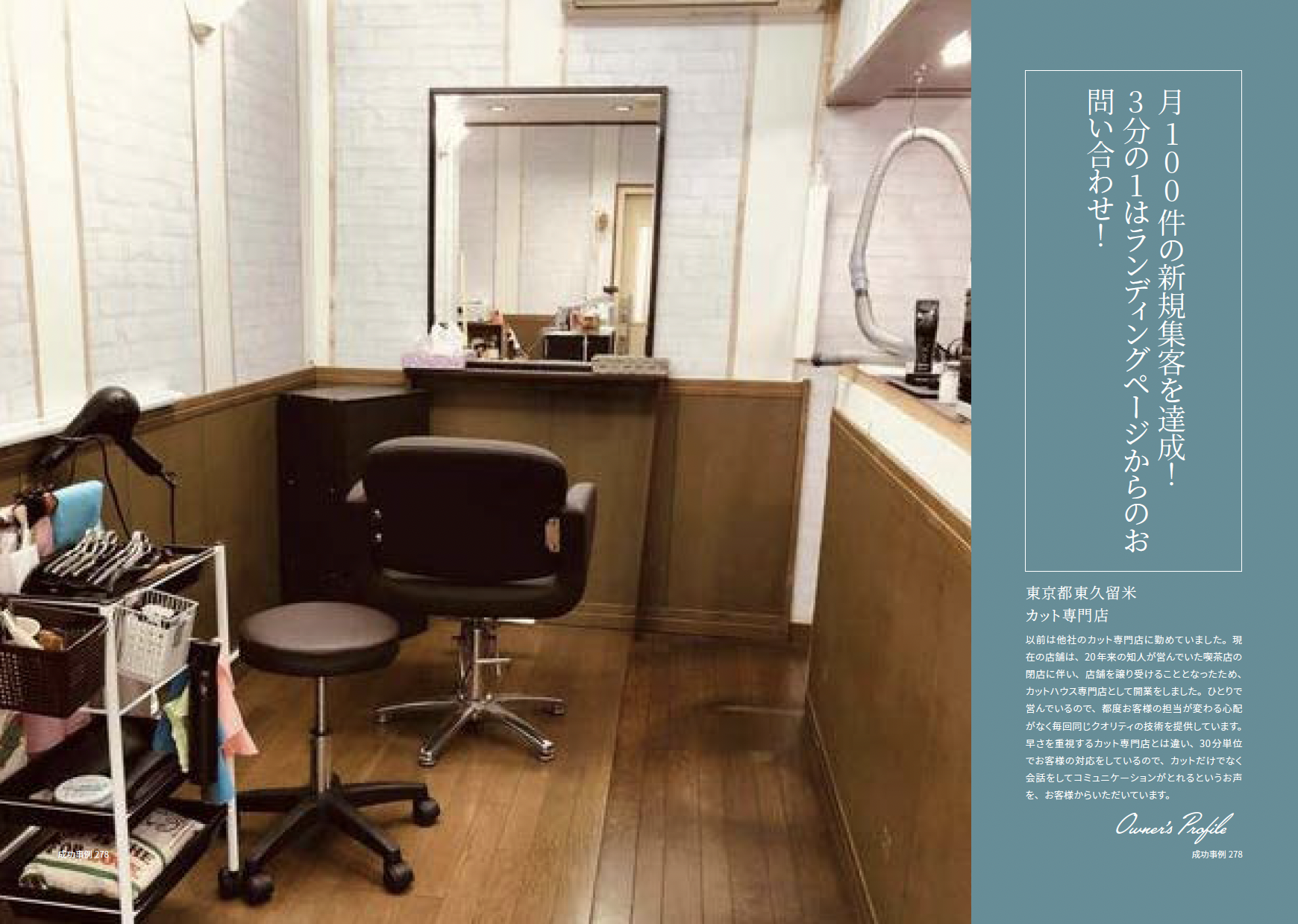 とても反響を感じています。開業当初は、近所の方からのご紹介でご来店されるお客様が多かったのですが、ランディングページ制作導入後、三ヶ月を過ぎた頃から、徐々にランディングページを見てご来店くださるお客様が増え始めました。今では月に百名ほど、新規のお客様からお問い合わせをいただいているのですが、三分の一はランディングページからのお問い合わせです。以前、近辺に引っ越してきた方から、「【地域+千円カット】で検索をかけた際に、検索順位で上位に出てきたので、お店の情報や口コミを見てきました」とお声をいただくことがありましたし、周辺地域だけでなく、遠方から用事でいらした方が、当店で散髪をしてから帰られることもあり、遠方のお客様もランディングページで獲得する事ができています。客層に関しても幅が広がっており、20代から30代のお客様がランディングページを見て、当店に足を運んできてくれるようになりました。