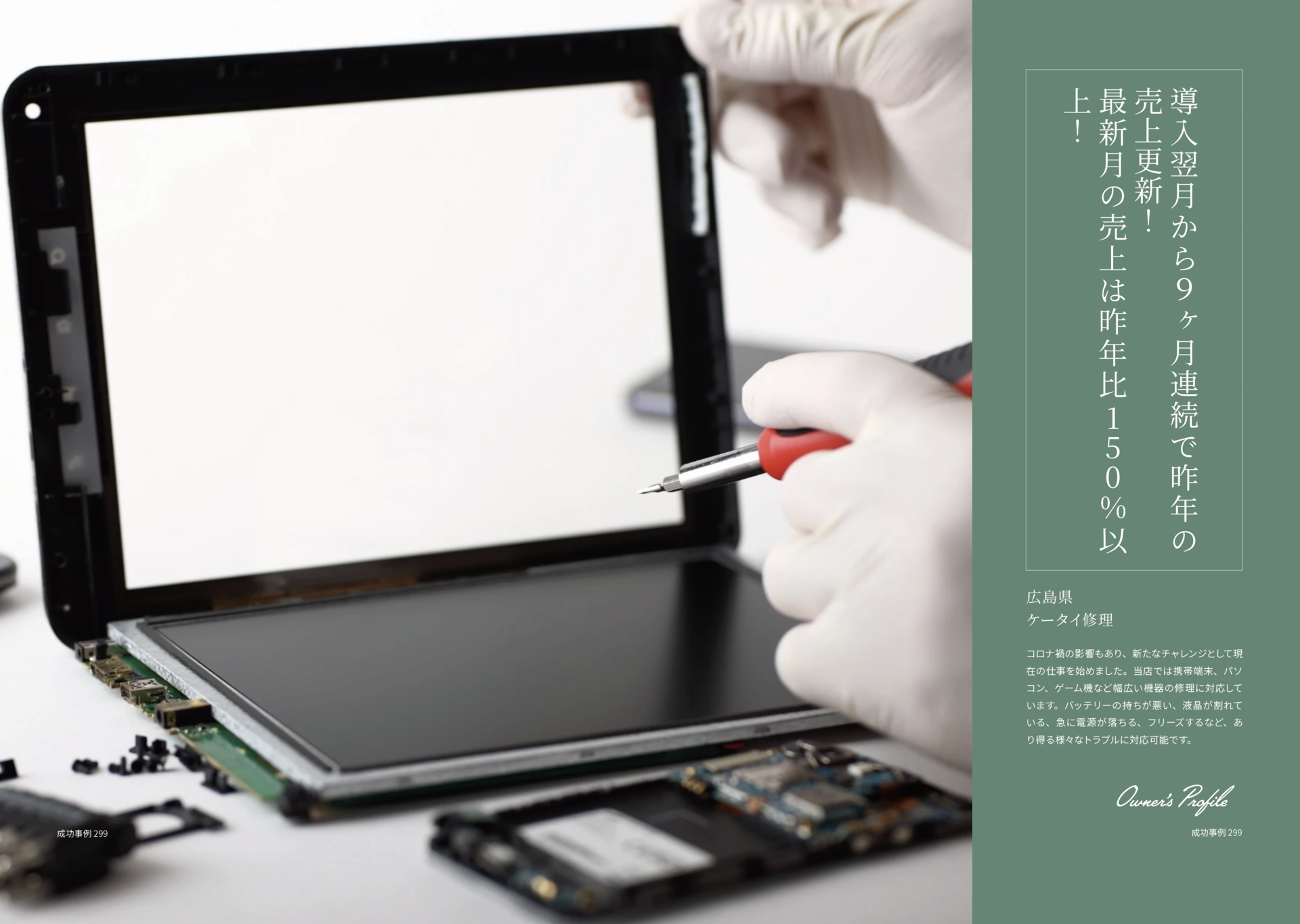 驚くべき反響が出ています。導入した翌月から九ヶ月連続で昨年の売上を上回り、特に問い合わせが激減した昨年と、今年の同月を比較すると、前年比が150%以上になっています。初めに百ページの作成を目標に掲げ、ランディングページを導入した月からスタートダッシュを切りました。この戦略が非常に効果的であり、集客に大きく貢献したと考えています。現在では二百ページを越えるランディングページを作成しています。スポーツ新聞の様な見出しで、目に留まりやすくなるページを意識して作成しています。以前は、対応内容の問い合わせでご来店されるお客様が多かったのですが、今では直接店舗に機材を持ち込んで修理の依頼をされるお客様が増えています。こちらとしては、お客様を逃すことなく、説明の手間が省け、効率的な仕事を行うことができており、ランディングページが多くの方の目に触れていることを実感しています。