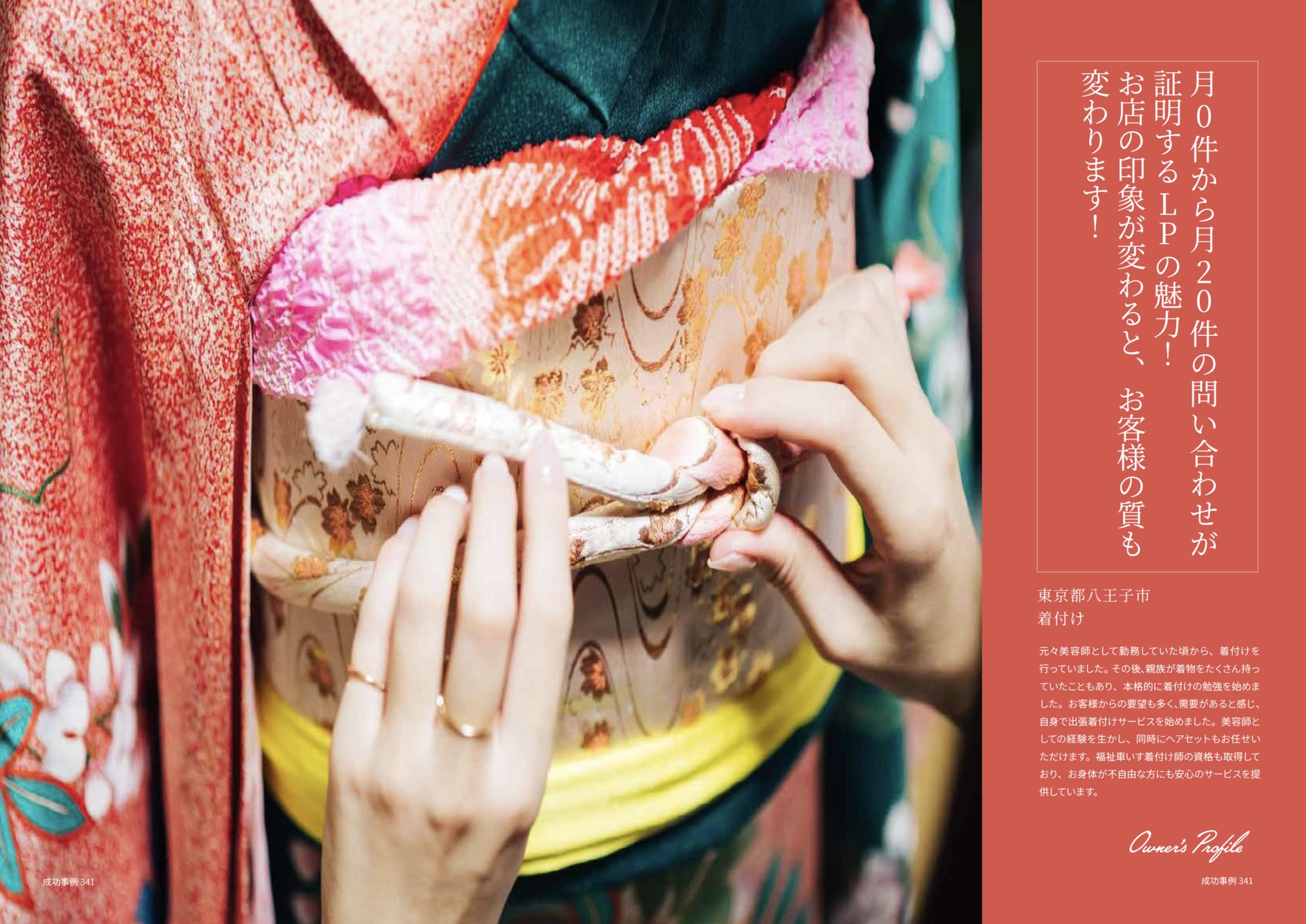 お問い合わせが入るようになりましたが、今後の改善点は、お客様のご希望時間がもう一方のご予約と被ってしまい、対応できず断らざるを得ないことです。この点について、着付け仲間の知人たちにお客様を紹介して、手伝ってもらえるシステムの構築を考えています。より多くのお客様にご満足いただけるサービスを提供していきたいです。