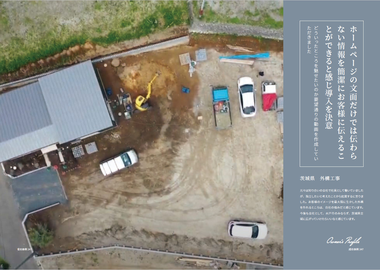 今まで動画を出している会社や、動画を組み込んだホームページが少ないと思っていたので、お話を伺った時に新しいなと思ったのがきっかけです。ホームページの文面だけでは伝わらない情報を簡潔にお客様に伝えることができると感じ導入を決意しました。営業の方には動画の内容や詳細を詳しく説明していただいたのですが、ドローンを使った動画の撮影には特に魅力を感じましたね。